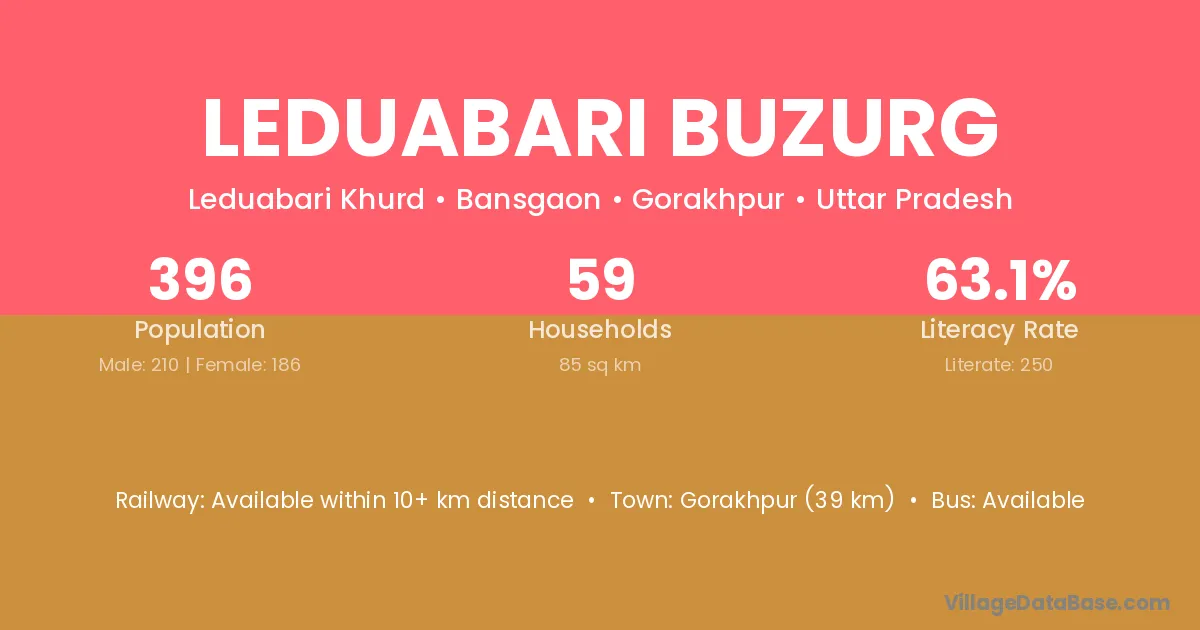 The literacy rate of Leduabari Buzurg village is 63.13%. Male literacy stands at 70.95% and female literacy at 54.30%.