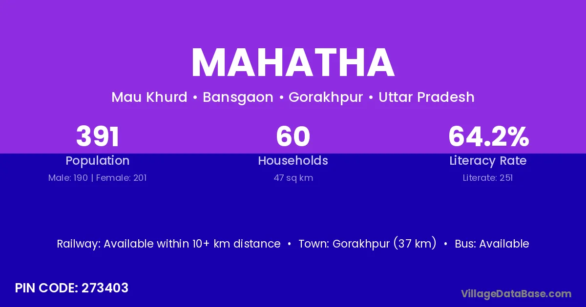 Gorakhpur (37 km) is the nearest town to Mahatha village for major economic activities and is located approximately 37 km away.