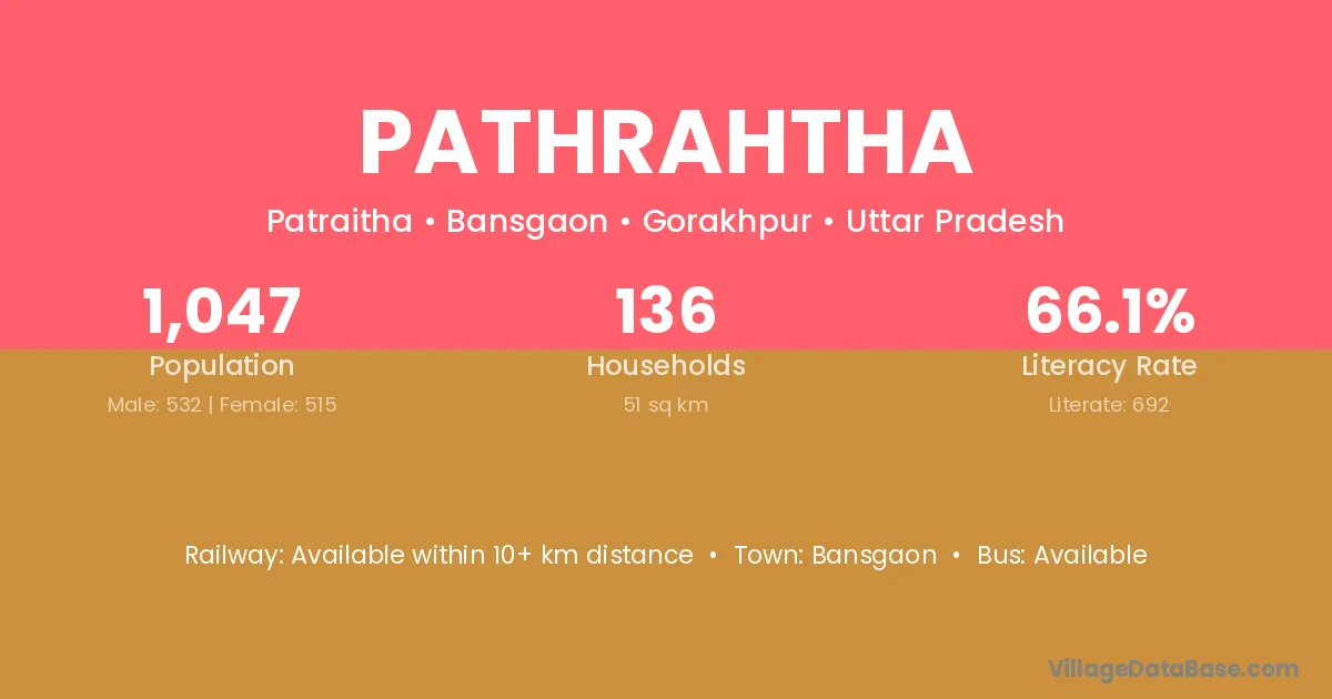 Pathrahtha village has a total population of 1,047 people, of which 532 are males and 515 are females.