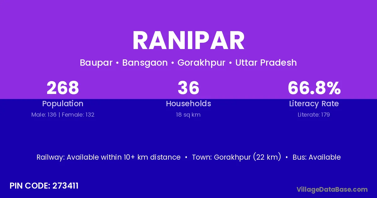 Gorakhpur (22 km) is the nearest town to Ranipar village for major economic activities and is located approximately 22 km away.