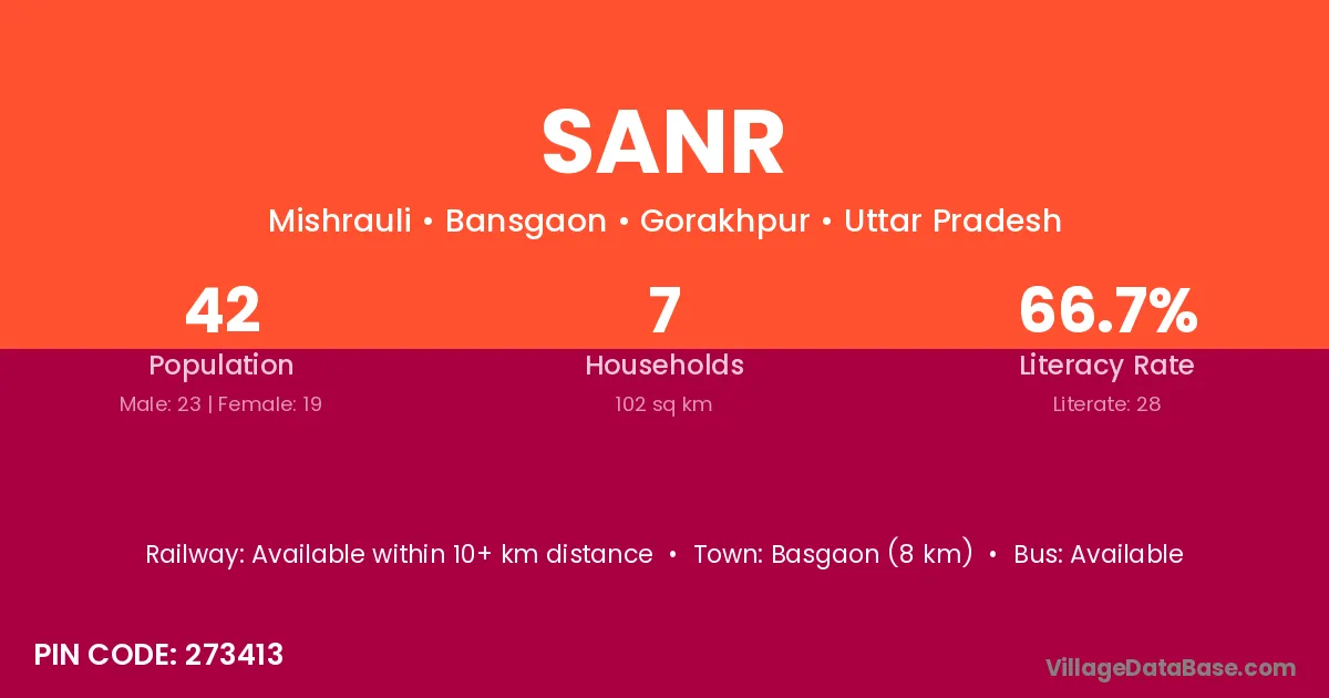 Sanr village has a total population of 42 people, of which 23 are males and 19 are females.