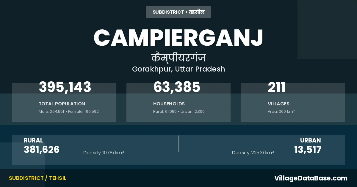 According to the 2011 census The total area of Campierganj Tehsil is 360 km², with a population of 395143 people. The population density is 1,097 inhabitants per square kilometre, and there are approximately 63385 houses in the sub district.