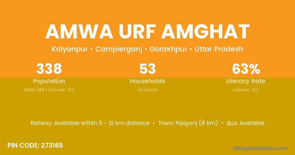 Amwa Urf Amghat village has a total population of 338 people, of which 186 are males and 152 are females.