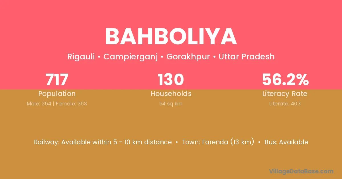 Bahboliya village has a total population of 717 people, of which 354 are males and 363 are females.