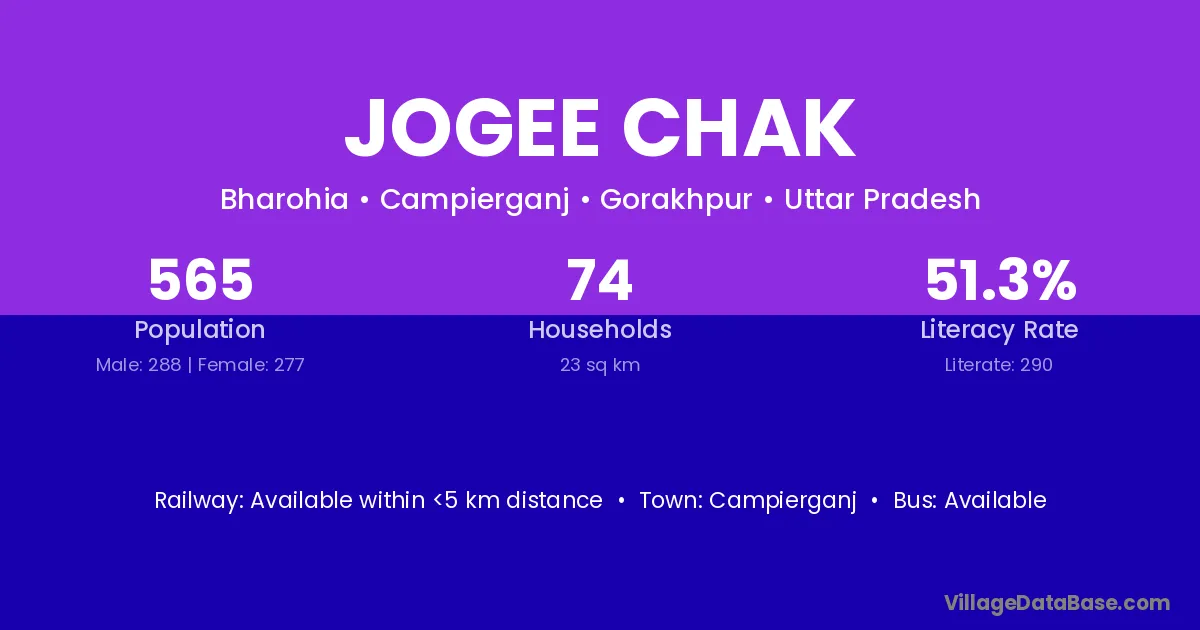 Jogee Chak village has a total population of 565 people, of which 288 are males and 277 are females.