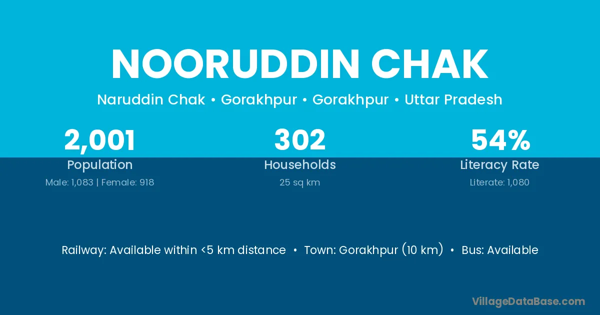 Nooruddin Chak village has a total population of 2,089 people, of which 1,100 are males and 989 are females.