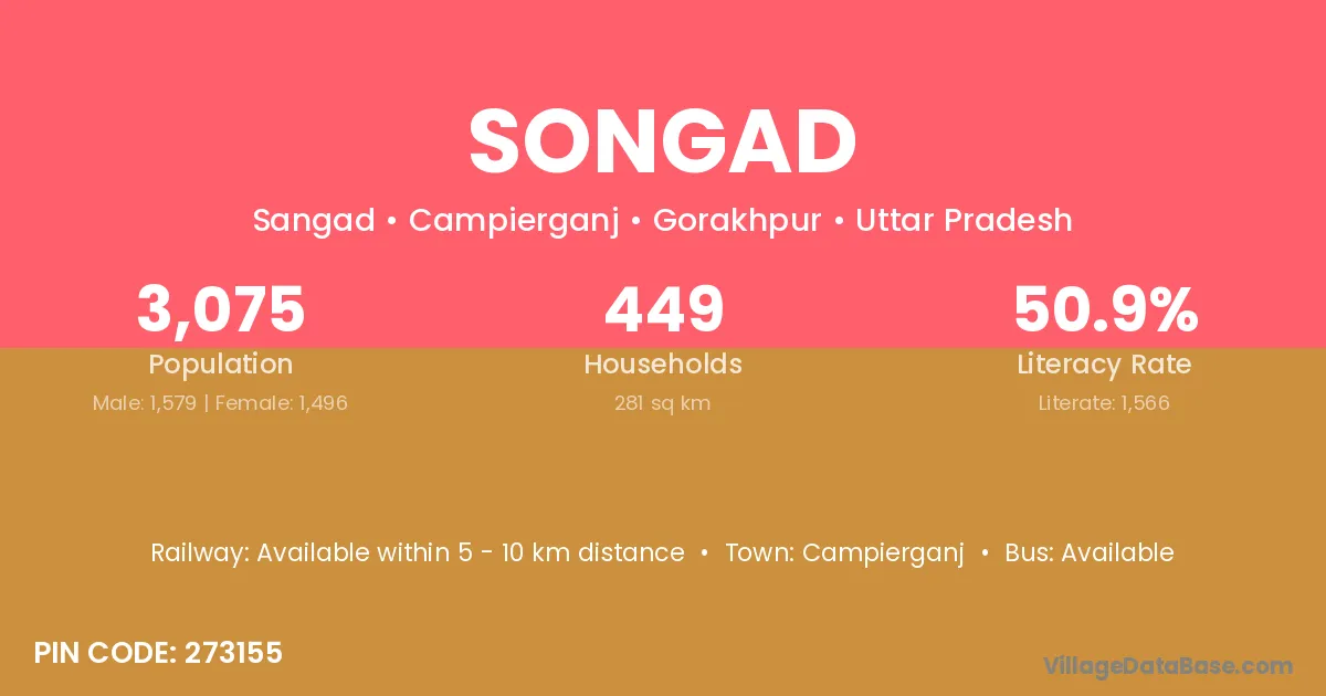 Songad village has a total population of 3,075 people, of which 1,579 are males and 1,496 are females.