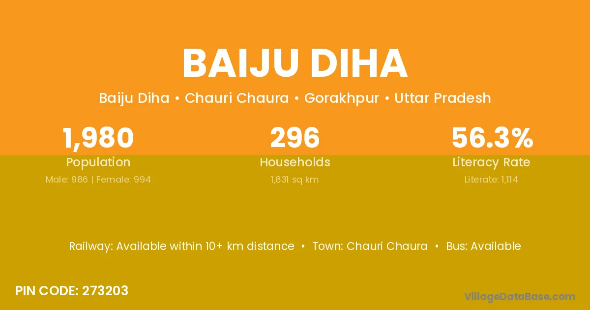 Baiju Diha village has a total population of 1,980 people, of which 986 are males and 994 are females.