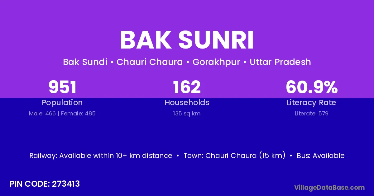 Chauri Chaura (15 km) is the nearest town to Bak Sunri village for major economic activities and is located approximately 15 km away.