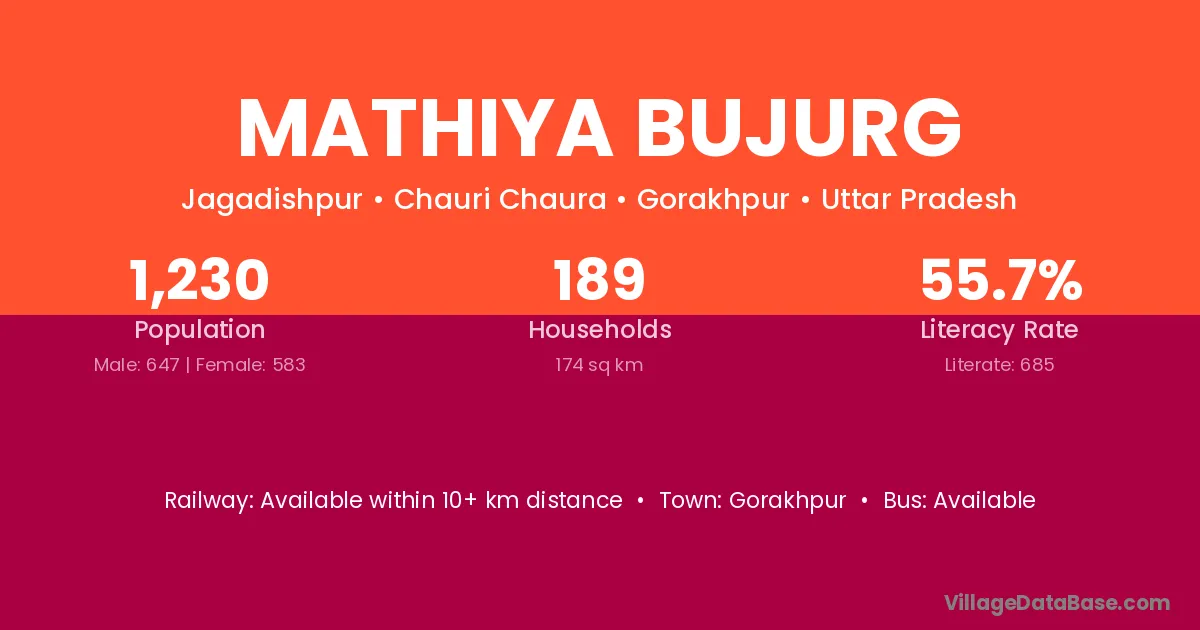 Mathiya Bujurg village has a total population of 1,230 people, of which 647 are males and 583 are females.