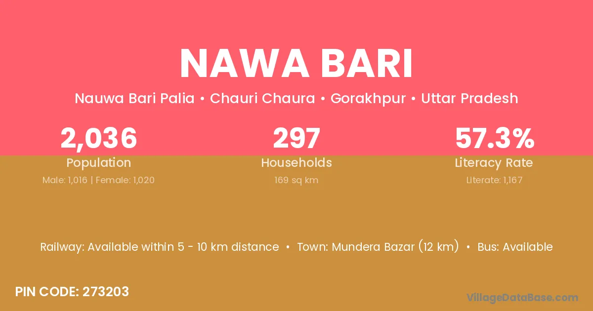 Nawa Bari village has a total population of 2,036 people, of which 1,016 are males and 1,020 are females.