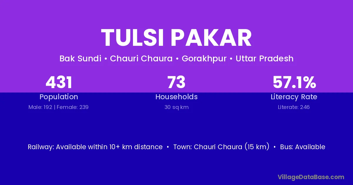 Tulsi Pakar village has a total population of 431 people, of which 192 are males and 239 are females.