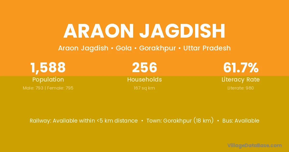 Gorakhpur (18 km) is the nearest town to Araon Jagdish village for major economic activities and is located approximately 18 km away.