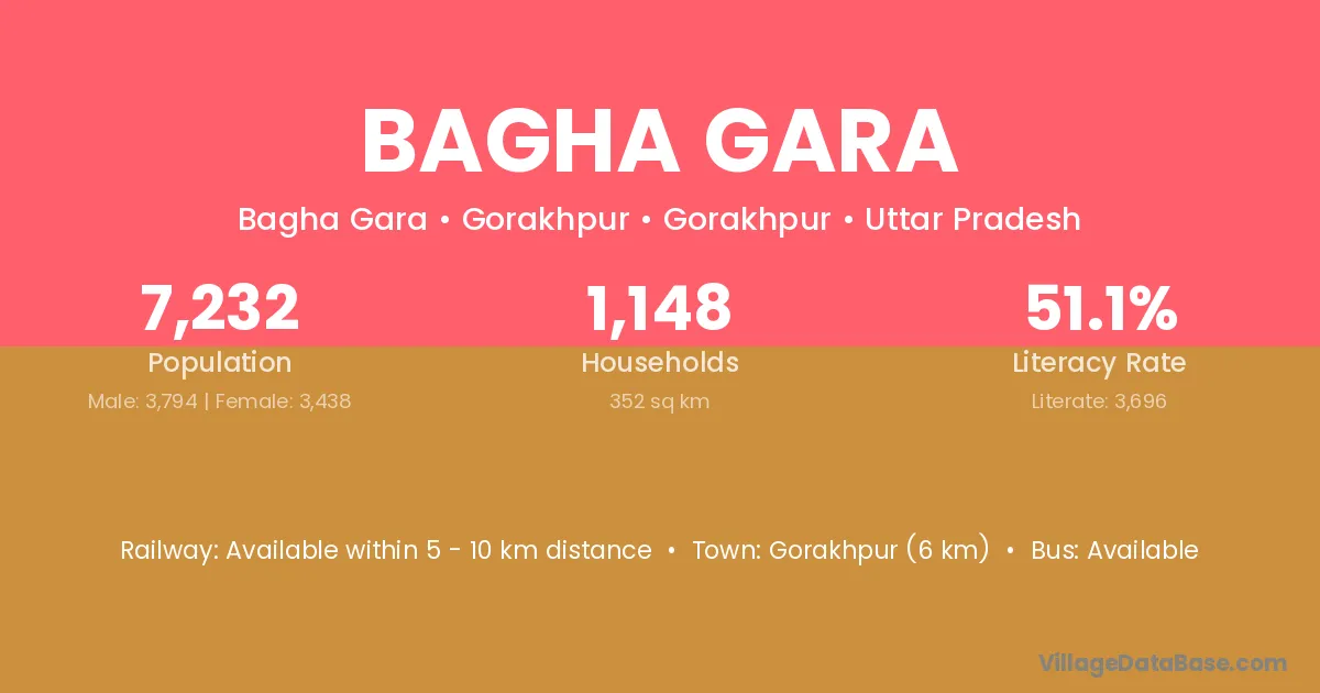Gorakhpur (60 km) is the nearest town to Bagha Gara village for major economic activities and is located approximately 60 km away.