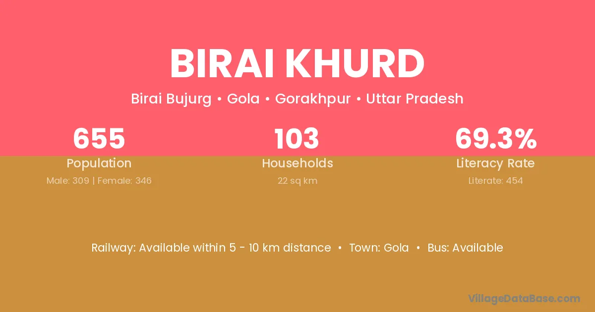 Birai Khurd village has a total population of 655 people, of which 309 are males and 346 are females.