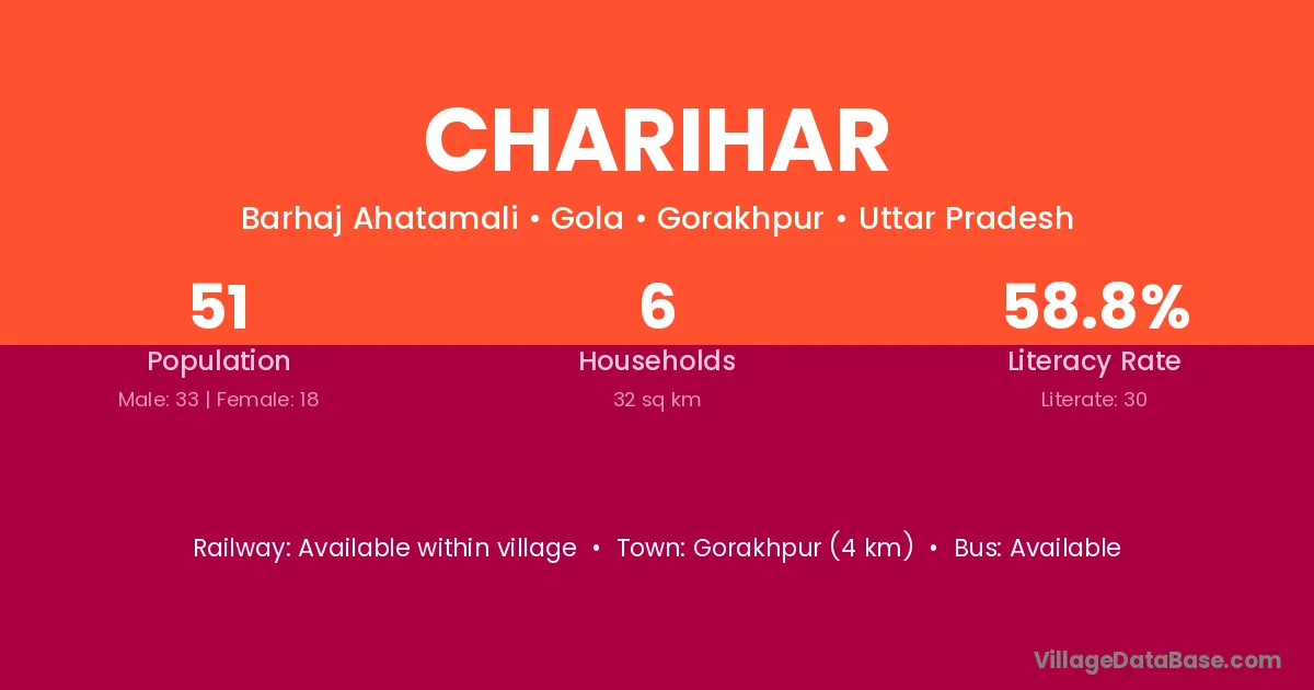 Charihar village has a total population of 51 people, of which 33 are males and 18 are females.