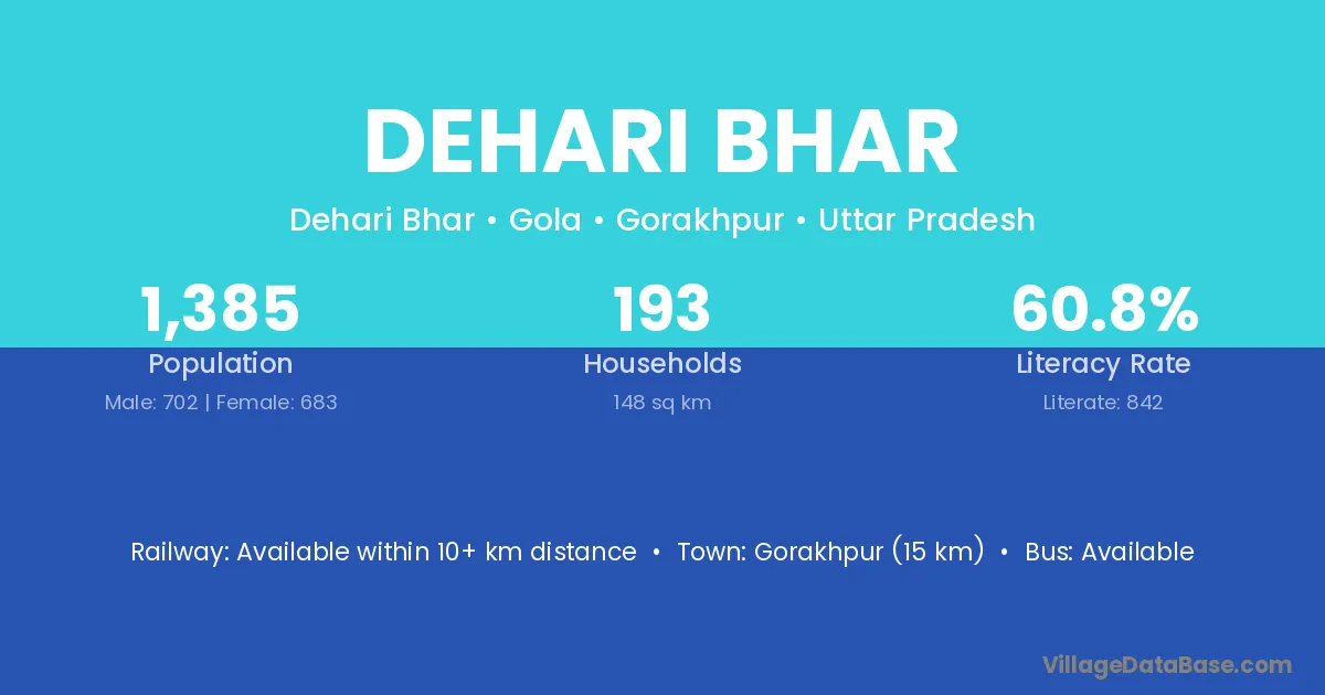 Dehari Bhar village has a total population of 1,385 people, of which 702 are males and 683 are females.
