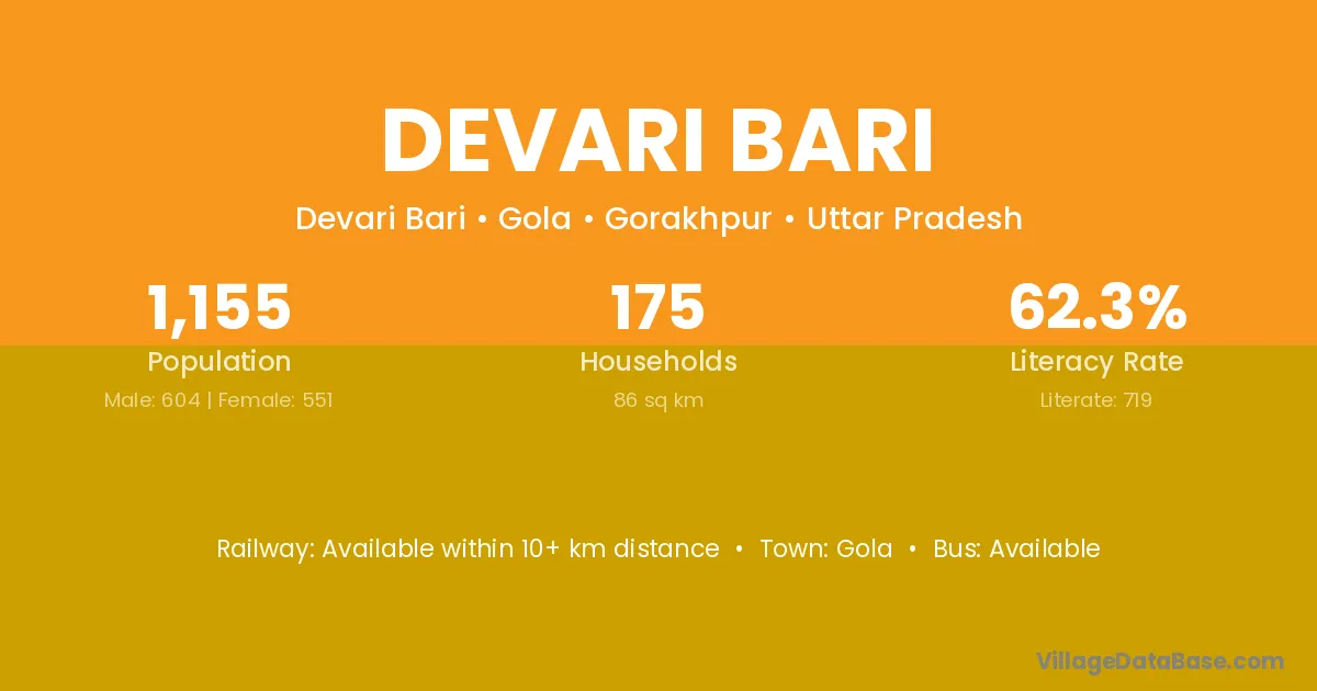 Devari Bari village has a total population of 1,155 people, of which 604 are males and 551 are females.