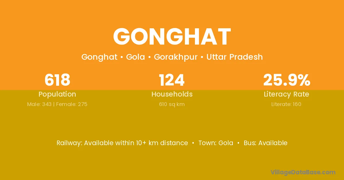 Gonghat village has a total population of 618 people, of which 343 are males and 275 are females.
