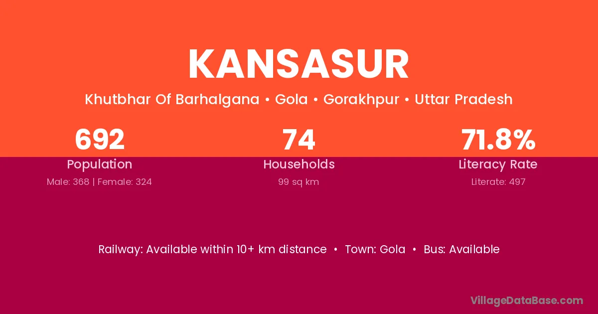 The literacy rate of Kansasur village is 71.82%. Male literacy stands at 82.07% and female literacy at 60.19%.