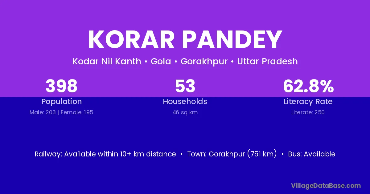 Korar Pandey village has a total population of 398 people, of which 203 are males and 195 are females.