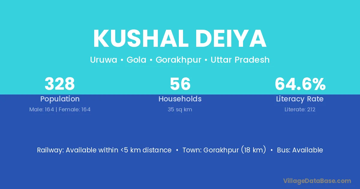 Kushal Deiya village has a total population of 328 people, of which 164 are males and 164 are females.