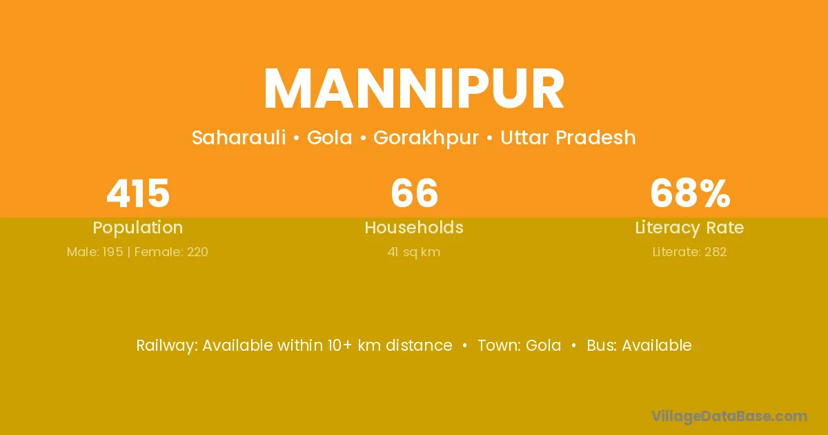 Mannipur village has a total population of 415 people, of which 195 are males and 220 are females.
