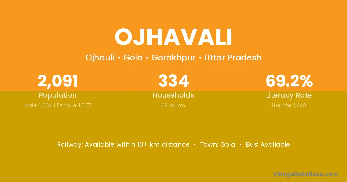 Ojhavali village has a total population of 2,091 people, of which 1,034 are males and 1,057 are females.