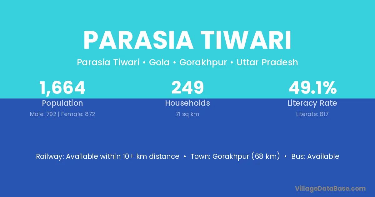 Gorakhpur (68 km) is the nearest town to Parasia Tiwari village for major economic activities and is located approximately 68 km away.