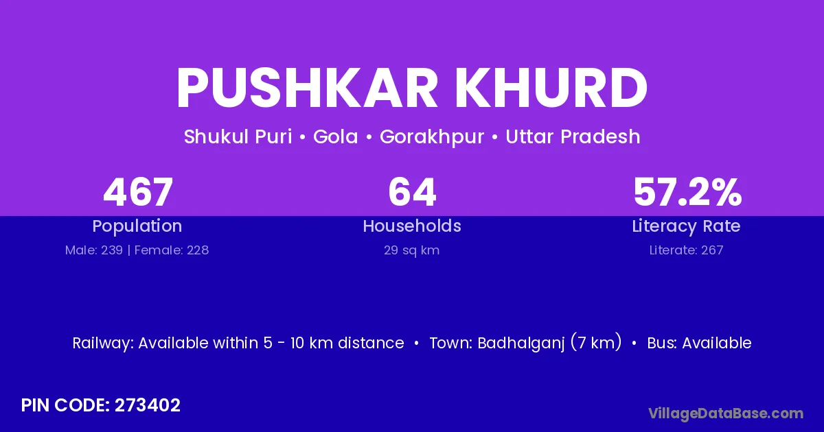 Pushkar Khurd village has a total population of 467 people, of which 239 are males and 228 are females.