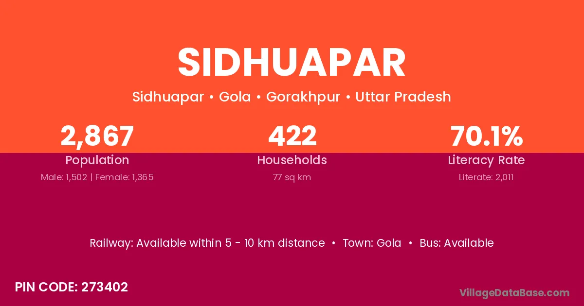 Sidhuapar village has a total population of 2,867 people, of which 1,502 are males and 1,365 are females.