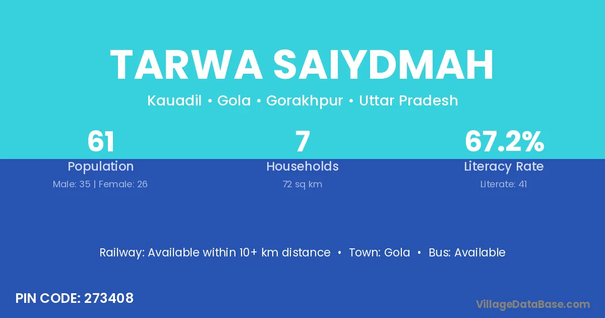 Tarwa Saiydmah village has a total population of 61 people, of which 35 are males and 26 are females.