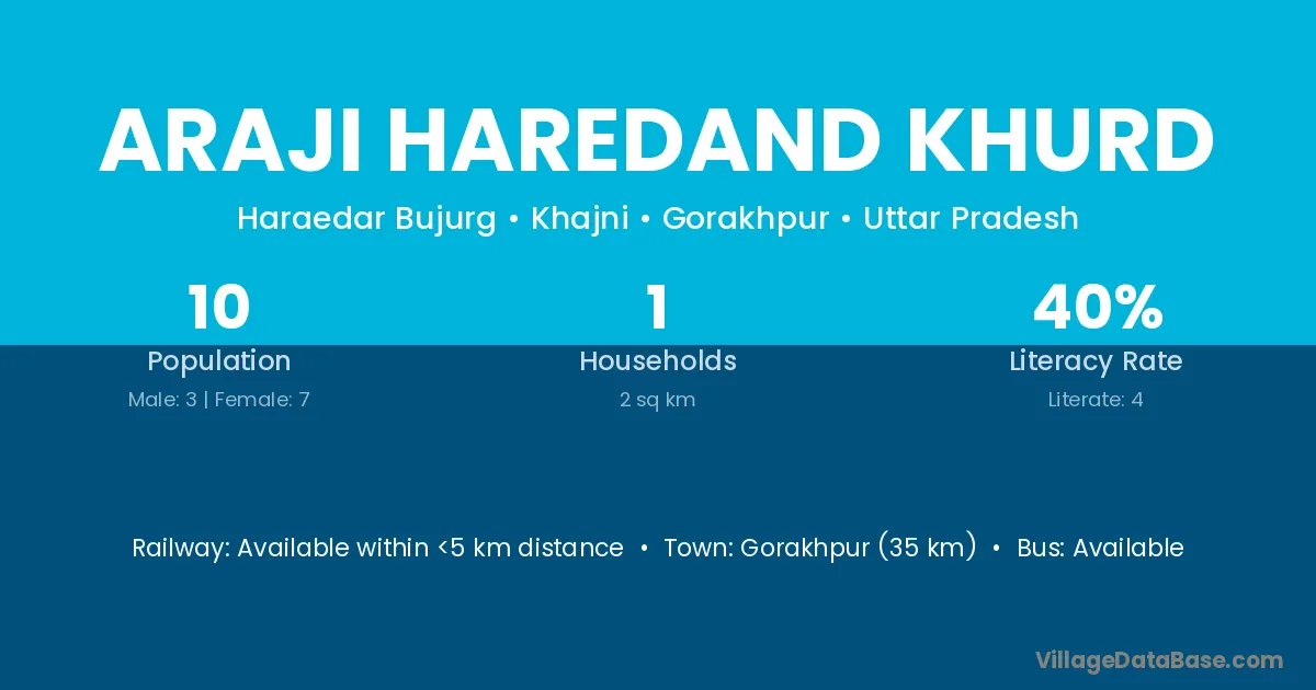 Araji Haredand Khurd village has a total population of 10 people, of which 3 are males and 7 are females.