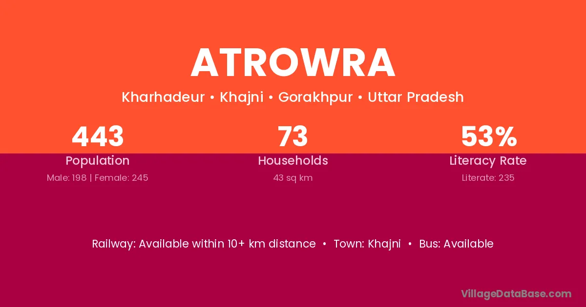 The literacy rate of Atrowra village is 53.05%. Male literacy stands at 64.65% and female literacy at 43.67%.
