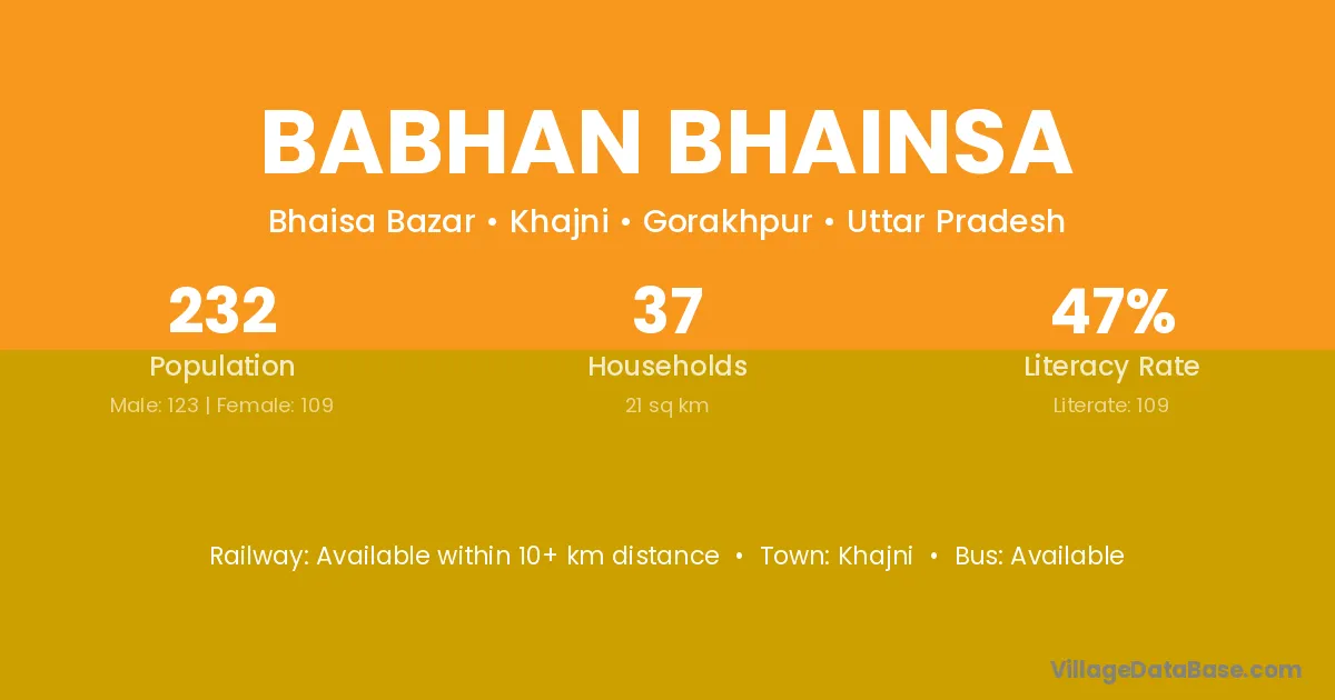 Babhan Bhainsa village has a total population of 232 people, of which 123 are males and 109 are females.
