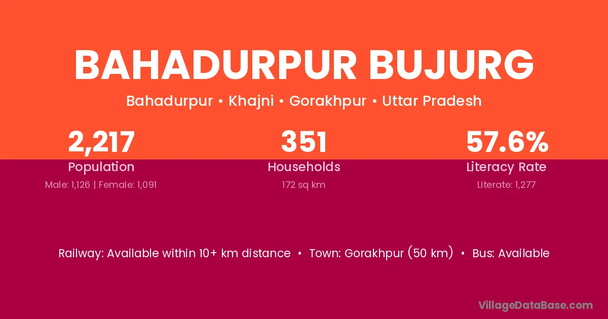 Bahadurpur Bujurg village has a total population of 2,217 people, of which 1,126 are males and 1,091 are females.