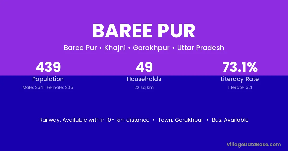 Baree Pur village has a total population of 439 people, of which 234 are males and 205 are females.