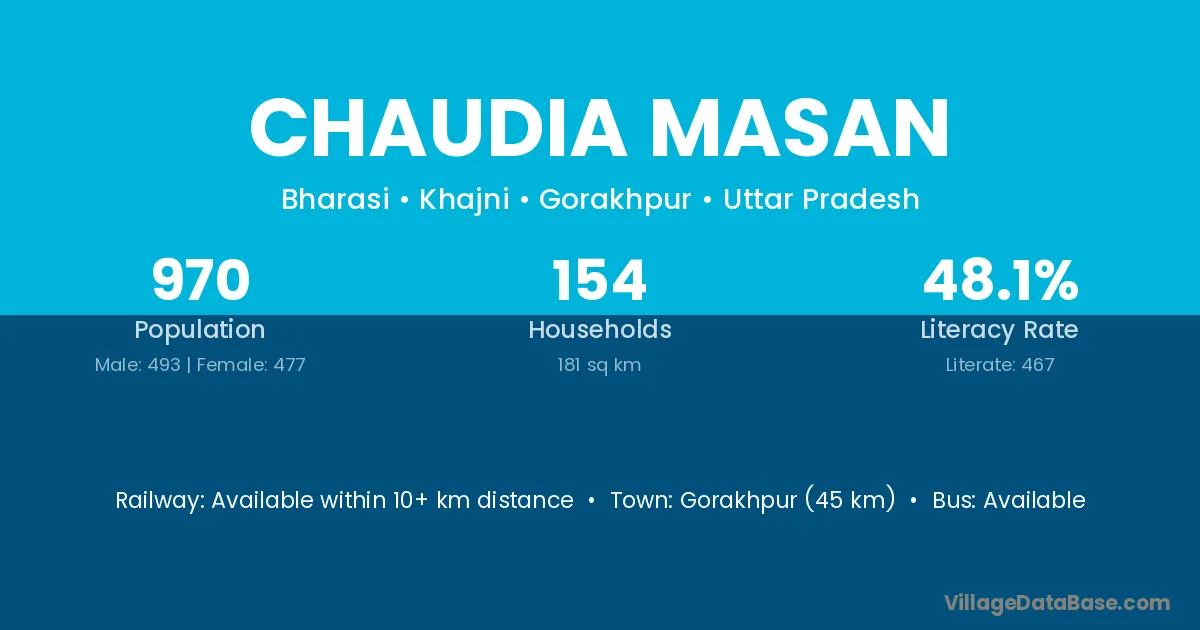 Chaudia Masan village has a total population of 970 people, of which 493 are males and 477 are females.