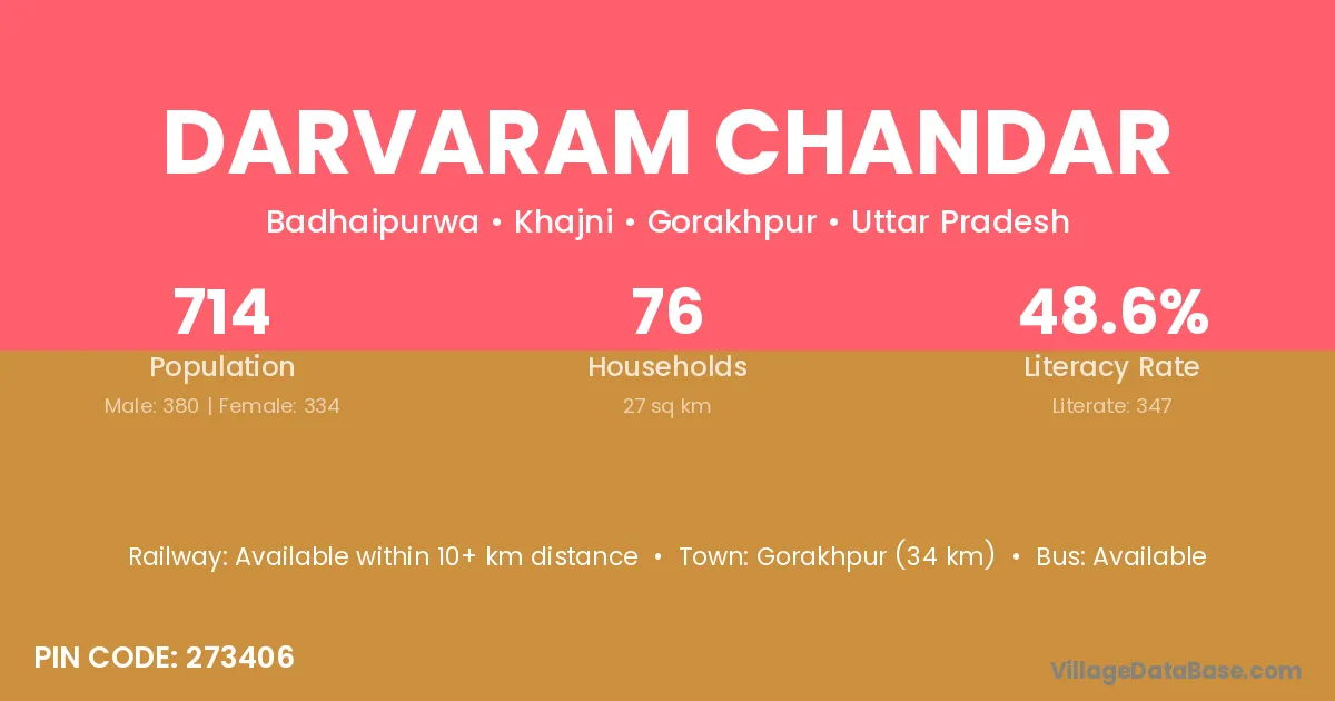 Gorakhpur (34 km) is the nearest town to Darvaram Chandar village for major economic activities and is located approximately 34 km away.