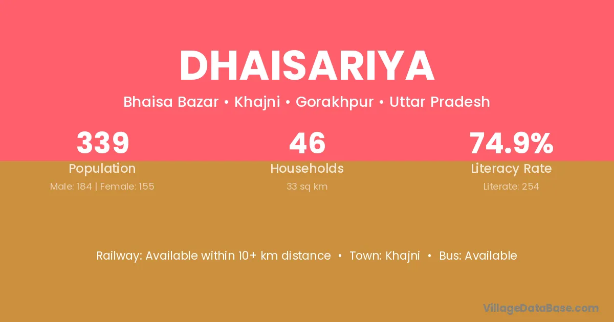 Dhaisariya village has a total population of 339 people, of which 184 are males and 155 are females.