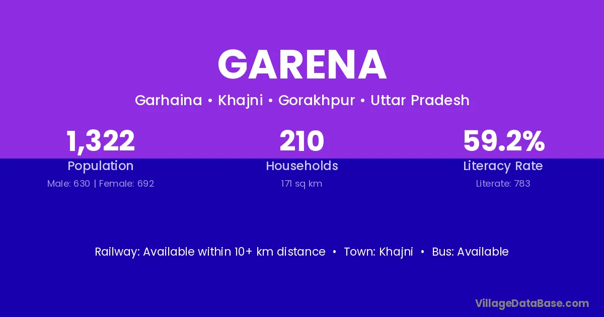 Garena village has a total population of 1,322 people, of which 630 are males and 692 are females.