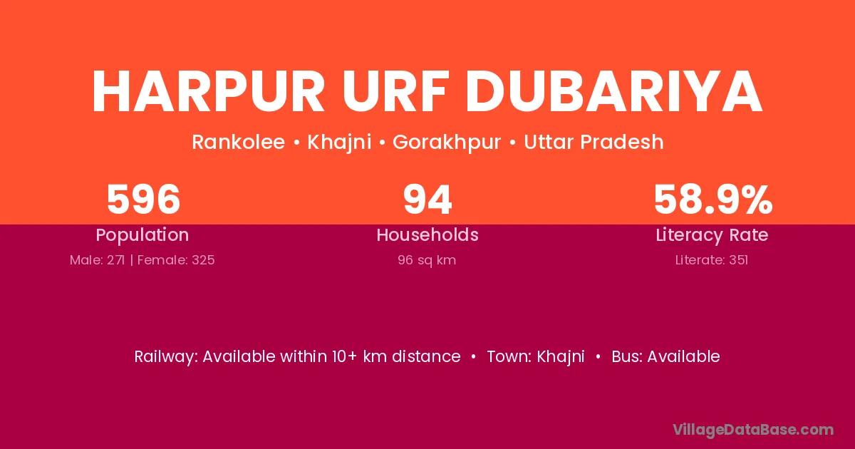 Harpur Urf Dubariya village has a total population of 596 people, of which 271 are males and 325 are females.