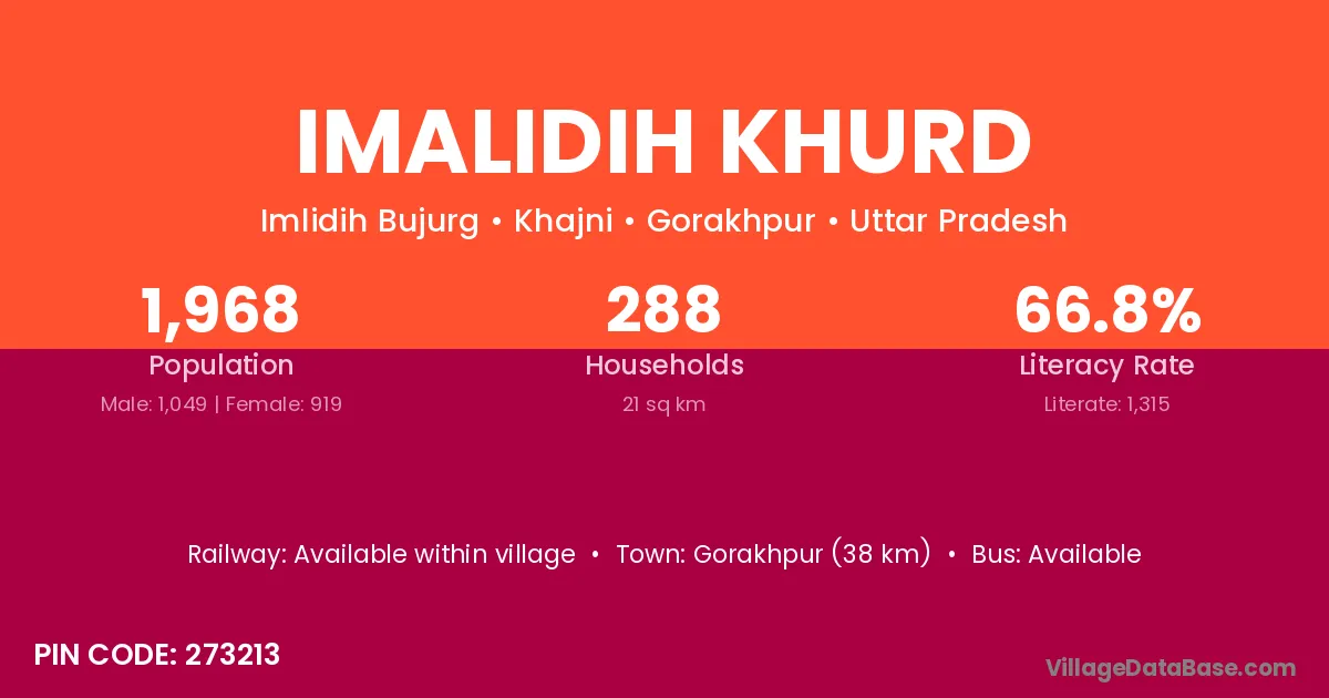 Imalidih Khurd village has a total population of 1,968 people, of which 1,049 are males and 919 are females.