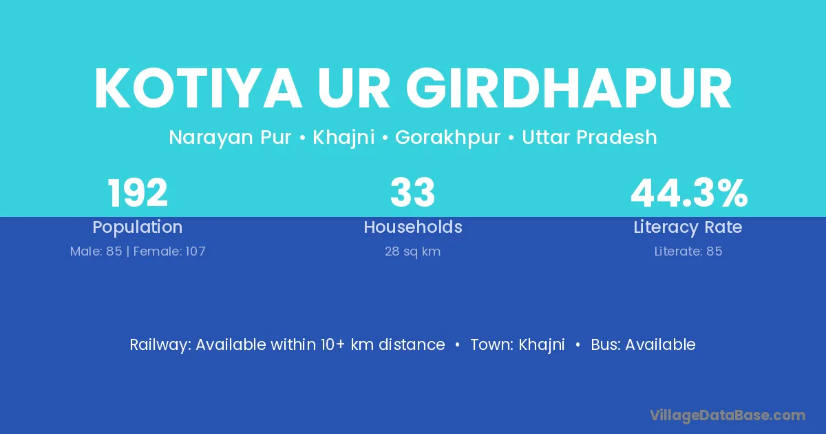 Kotiya Ur Girdhapur village has a total population of 192 people, of which 85 are males and 107 are females.