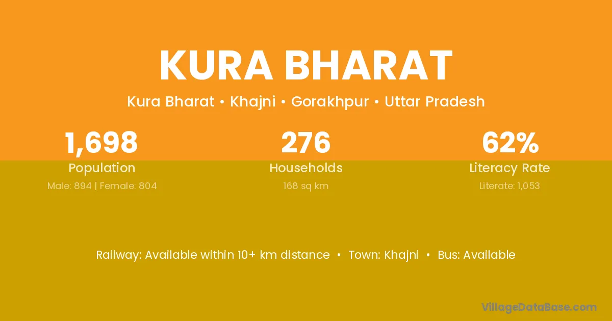 Kura Bharat village has a total population of 1,698 people, of which 894 are males and 804 are females.