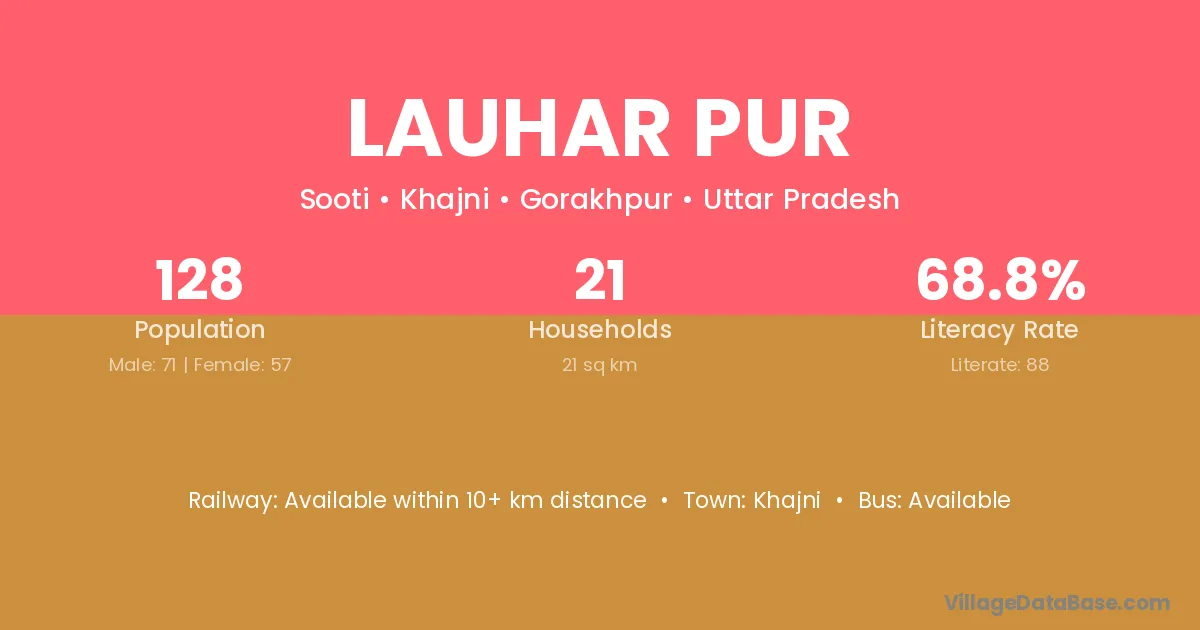 Lauhar Pur village has a total population of 128 people, of which 71 are males and 57 are females.