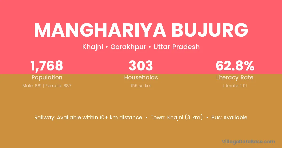 Manghariya Bujurg village has a total population of 1,768 people, of which 881 are males and 887 are females.