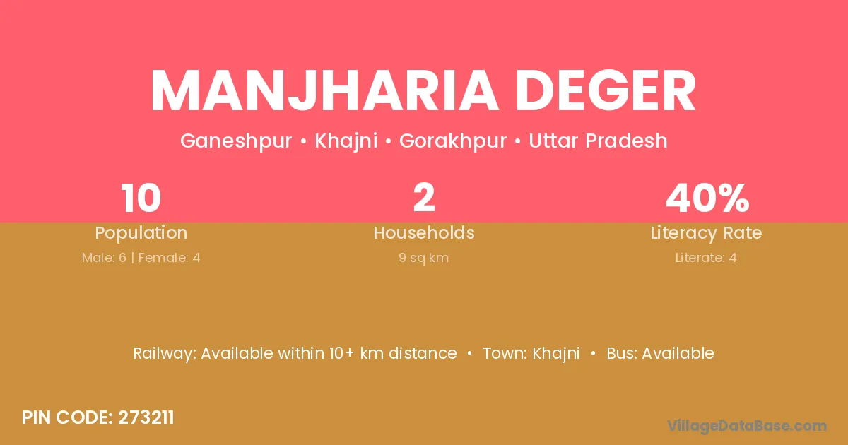 Manjharia Deger village has a total population of 10 people, of which 6 are males and 4 are females.