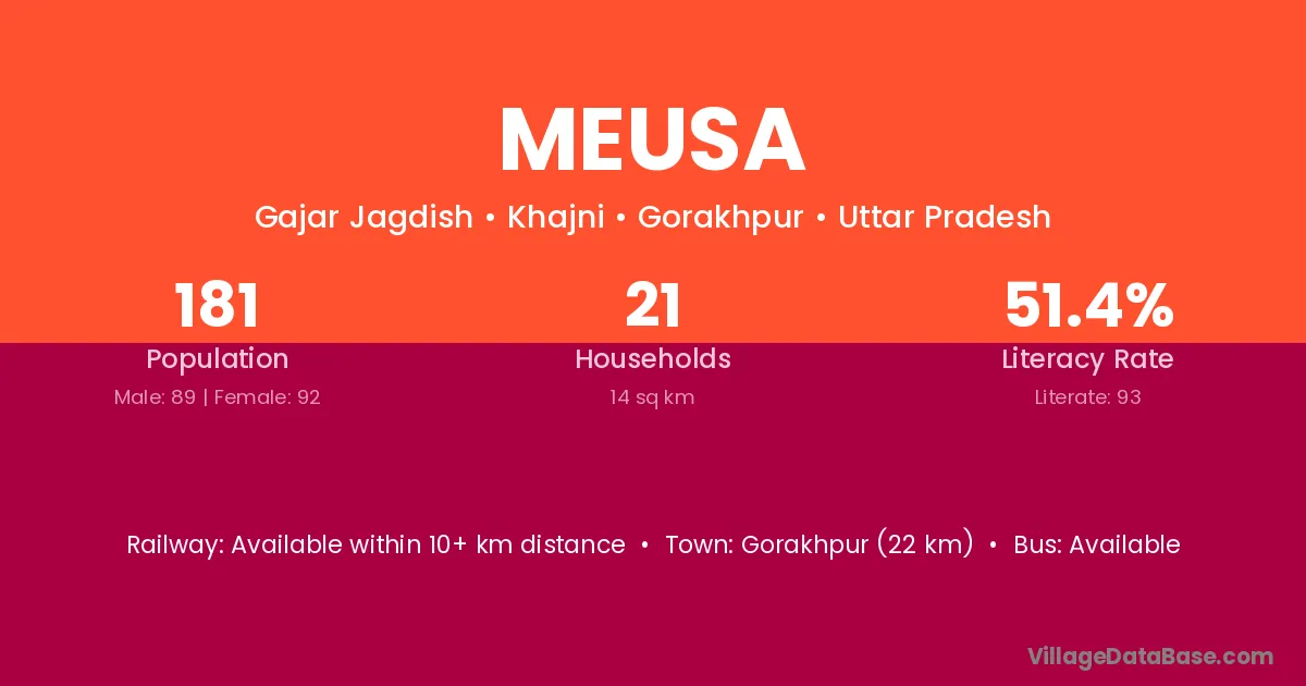 Gorakhpur (22 km) is the nearest town to Meusa village for major economic activities and is located approximately 22 km away.