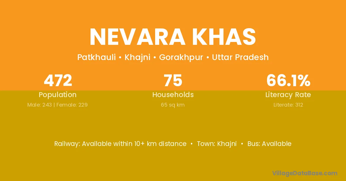 Nevara Khas village has a total population of 472 people, of which 243 are males and 229 are females.